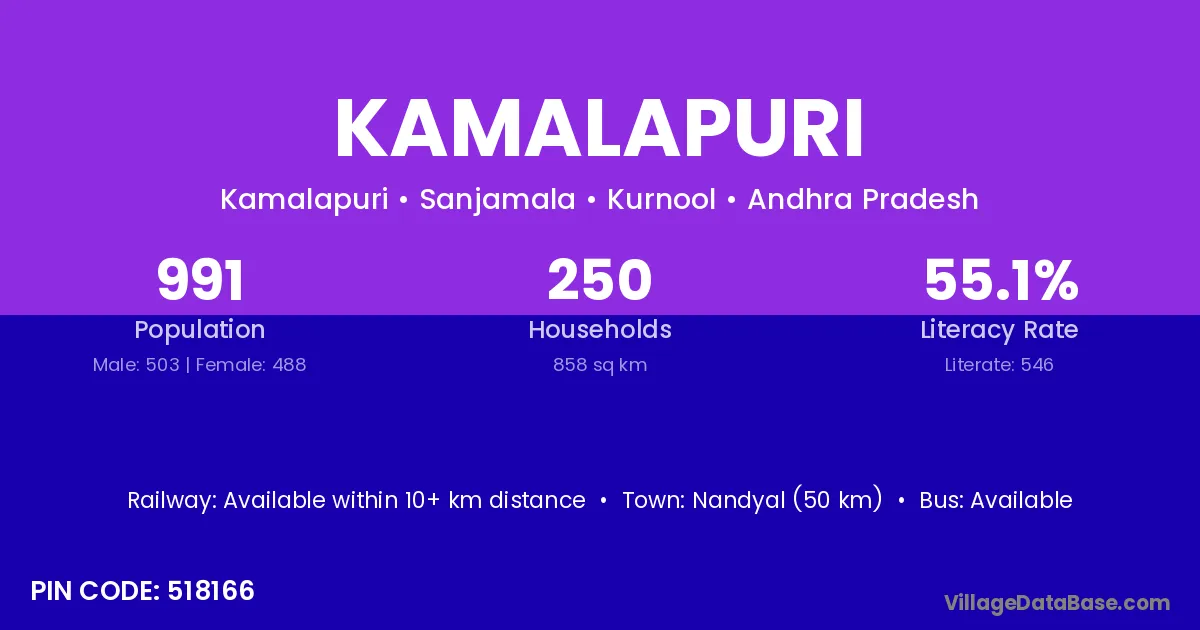 Nandyal (50 km) is the nearest town to Kamalapuri village for major economic activities and is located approximately 50 km away.