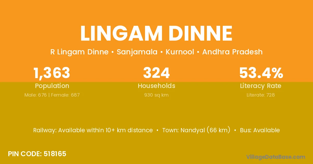 Nandyal (66 km) is the nearest town to Lingam Dinne village for major economic activities and is located approximately 66 km away.