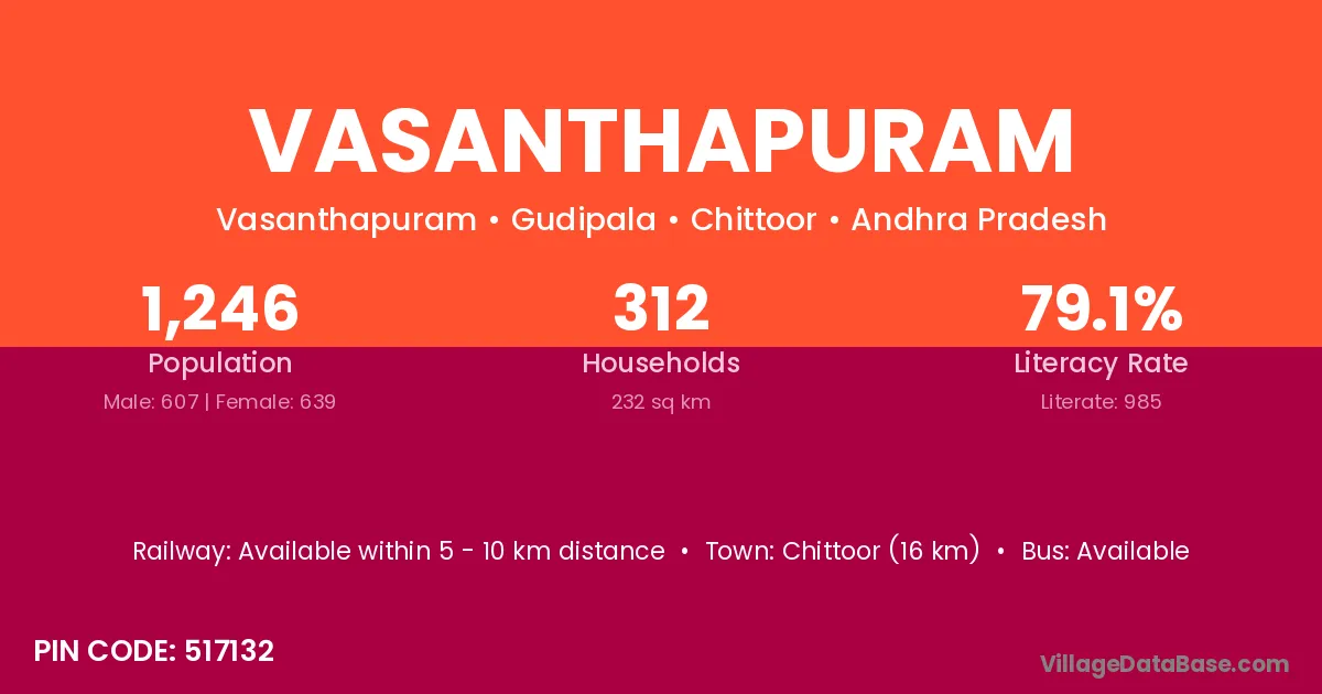 Vasanthapuram village has a total population of 613 people, of which 310 are males and 303 are females.