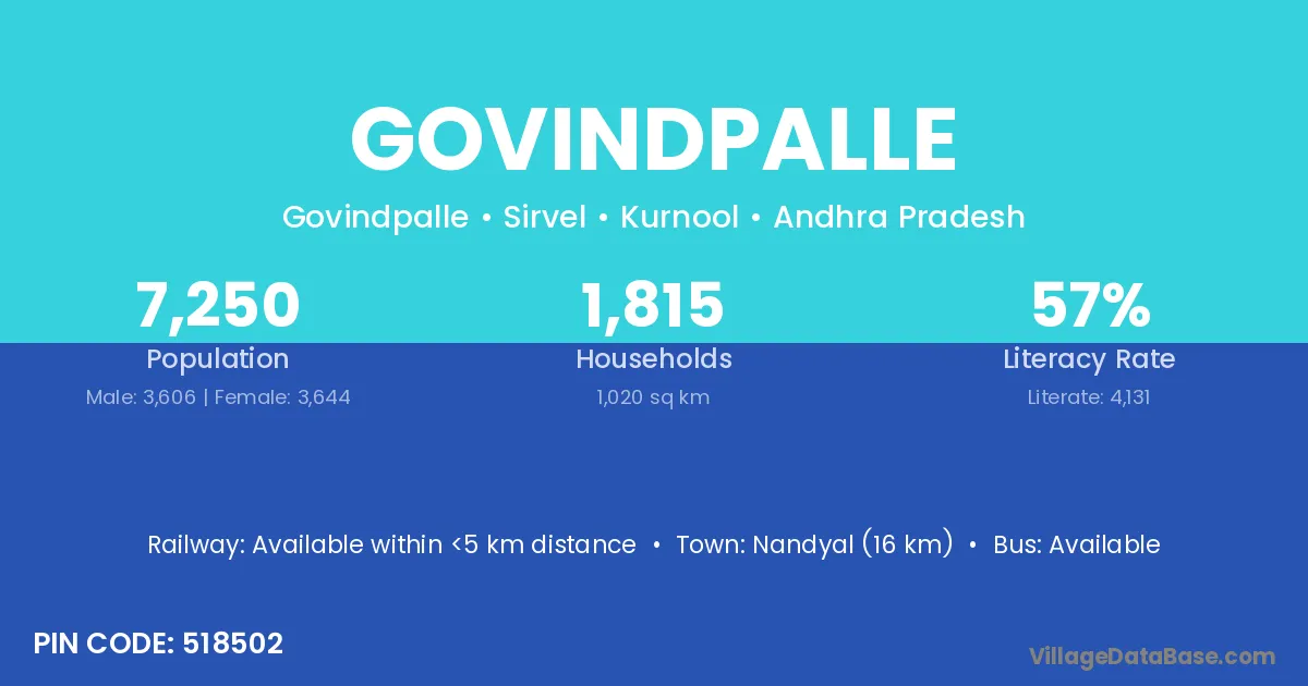 Nandyal (16 km) is the nearest town to Govindpalle village for major economic activities and is located approximately 16 km away.
