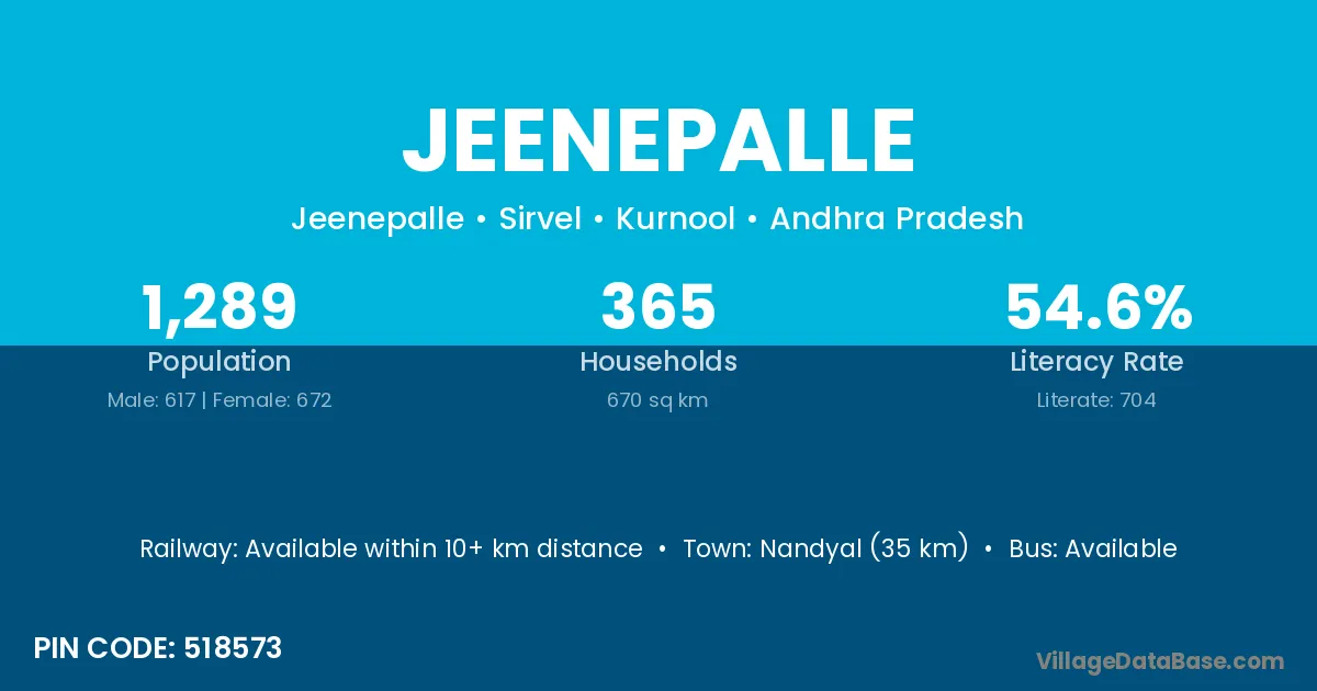 Nandyal (35 km) is the nearest town to Jeenepalle village for major economic activities and is located approximately 35 km away.