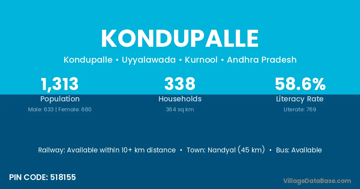 Nandyal (45 km) is the nearest town to Kondupalle village for major economic activities and is located approximately 45 km away.
