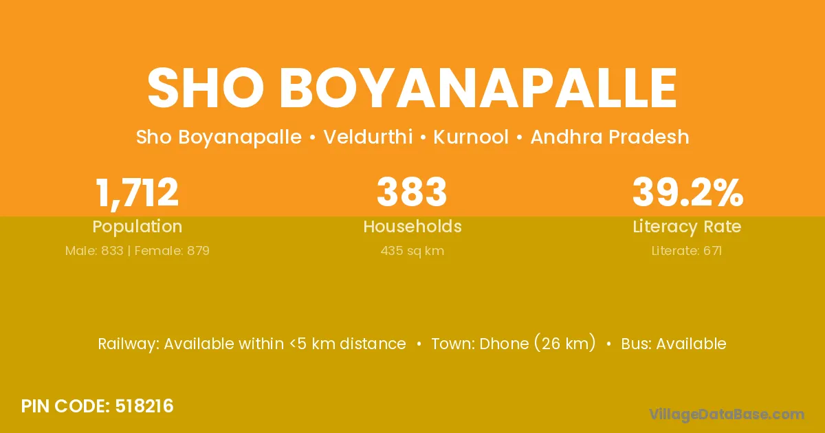 Dhone (26 km) is the nearest town to Sho Boyanapalle village for major economic activities and is located approximately 26 km away.