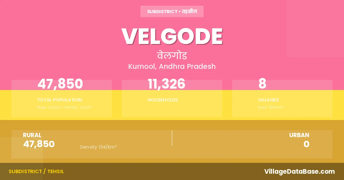 According to the 2011 census The total area of Velgode Mandal is 358 km², with a population of 47850 people. The population density is 134 inhabitants per square kilometre, and there are approximately 11326 houses in the sub district.