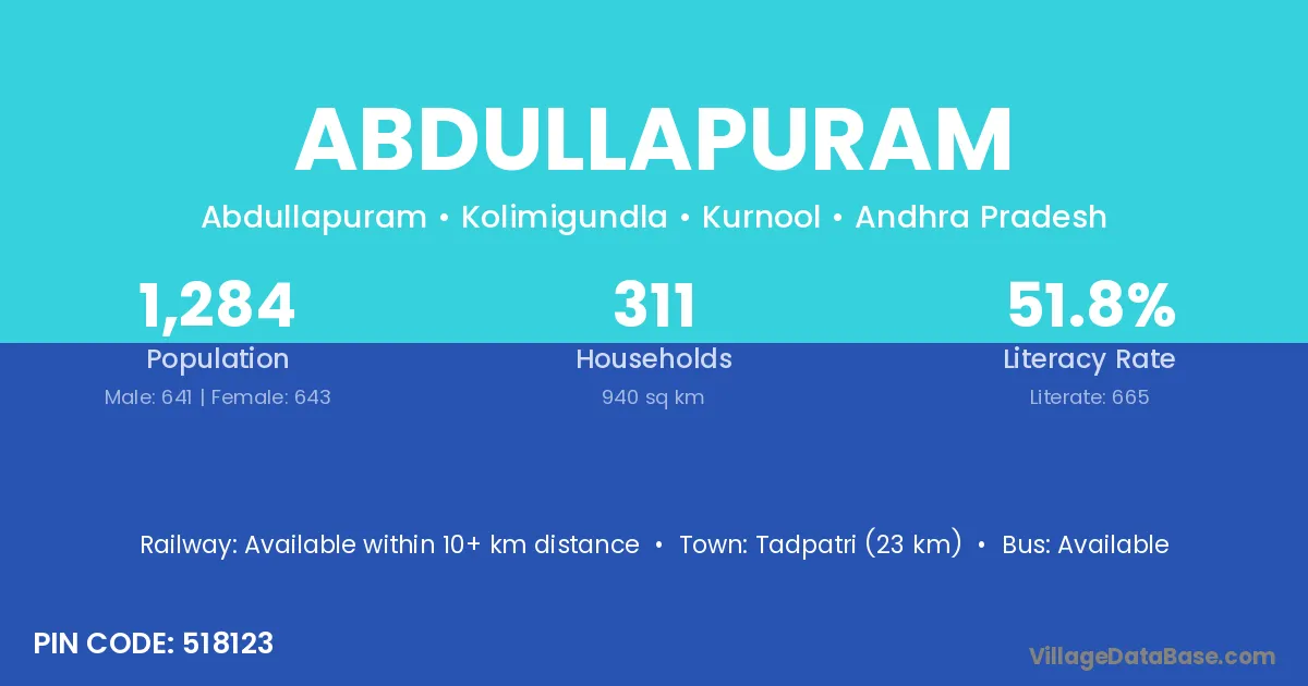 Nandyal (34 km) is the nearest town to Abdullapuram village for major economic activities and is located approximately 34 km away.