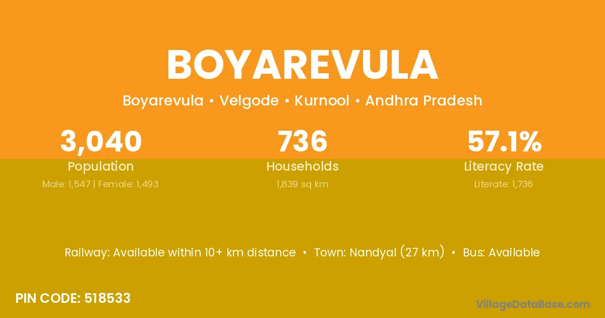 Nandyal (27 km) is the nearest town to Boyarevula village for major economic activities and is located approximately 27 km away.