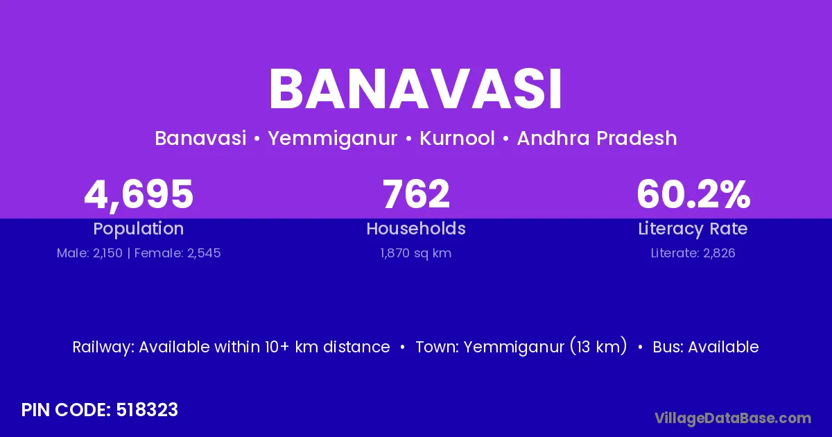 Yemmiganur (13 km) is the nearest town to Banavasi village for major economic activities and is located approximately 13 km away.
