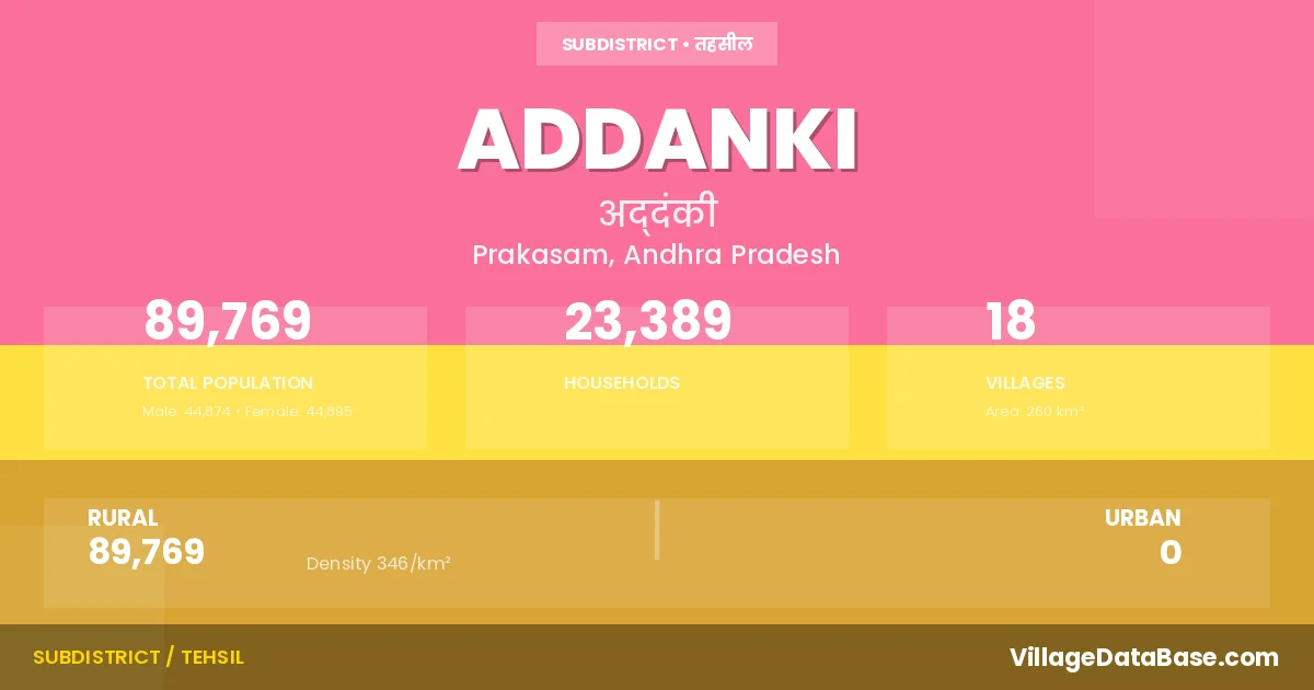 According to the 2011 census The total area of Addanki Mandal is 260 km², with a population of 89769 people. The population density is 346 inhabitants per square kilometre, and there are approximately 23389 houses in the sub district.