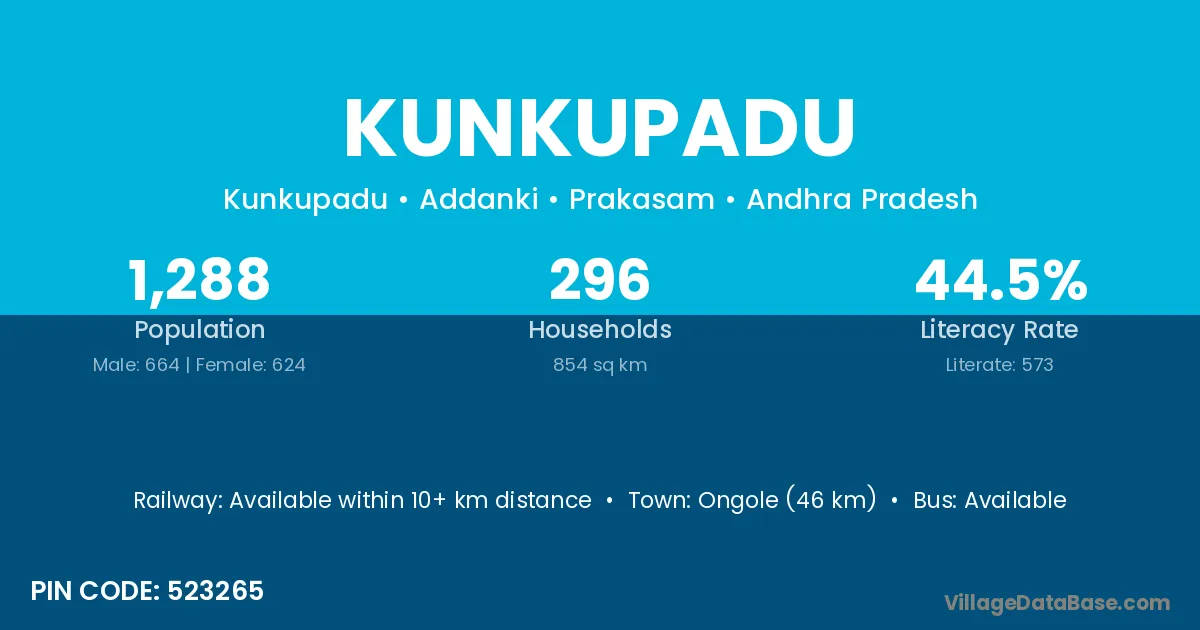 Ongole (46 km) is the nearest town to Kunkupadu village for major economic activities and is located approximately 46 km away.