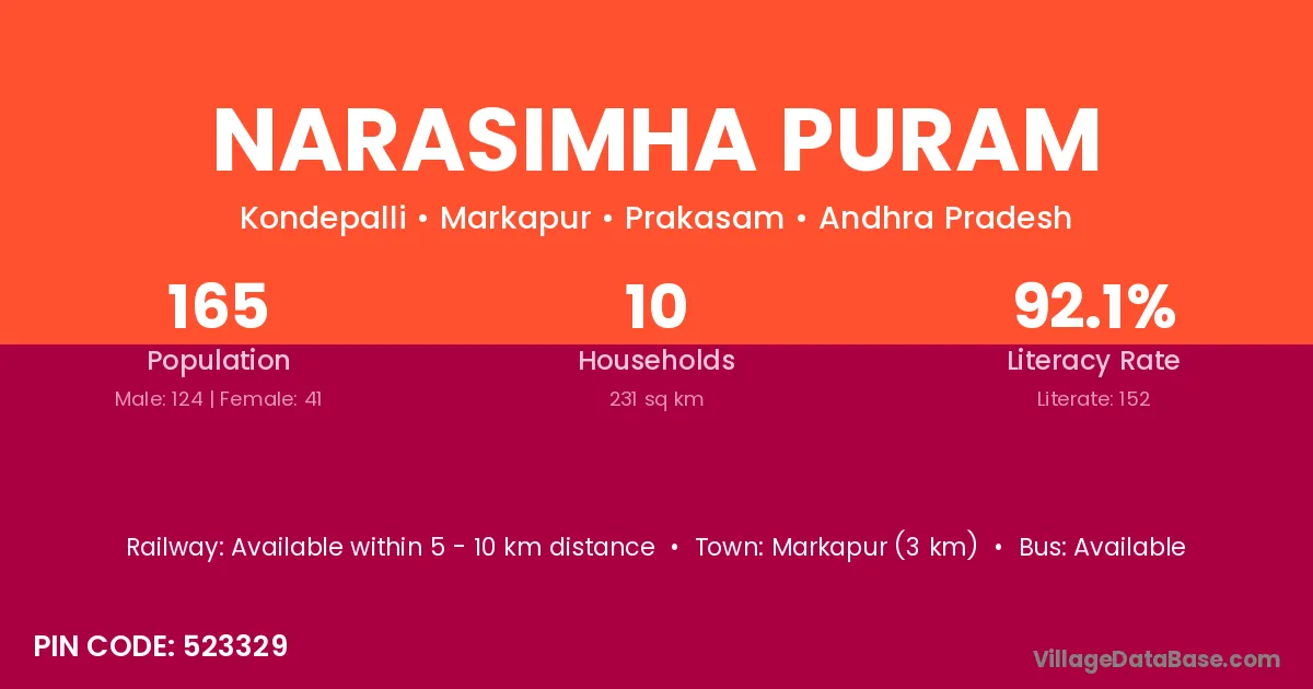 Ongole (39 km) is the nearest town to Narasimha Puram village for major economic activities and is located approximately 39 km away.