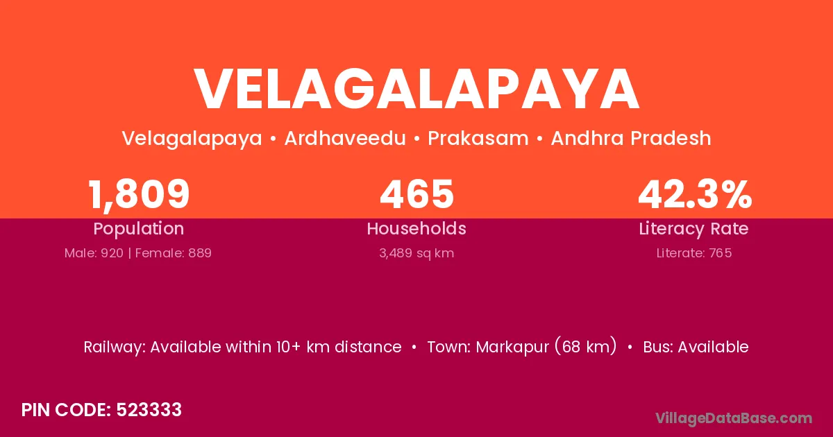 Markapur (68 km) is the nearest town to Velagalapaya village for major economic activities and is located approximately 68 km away.