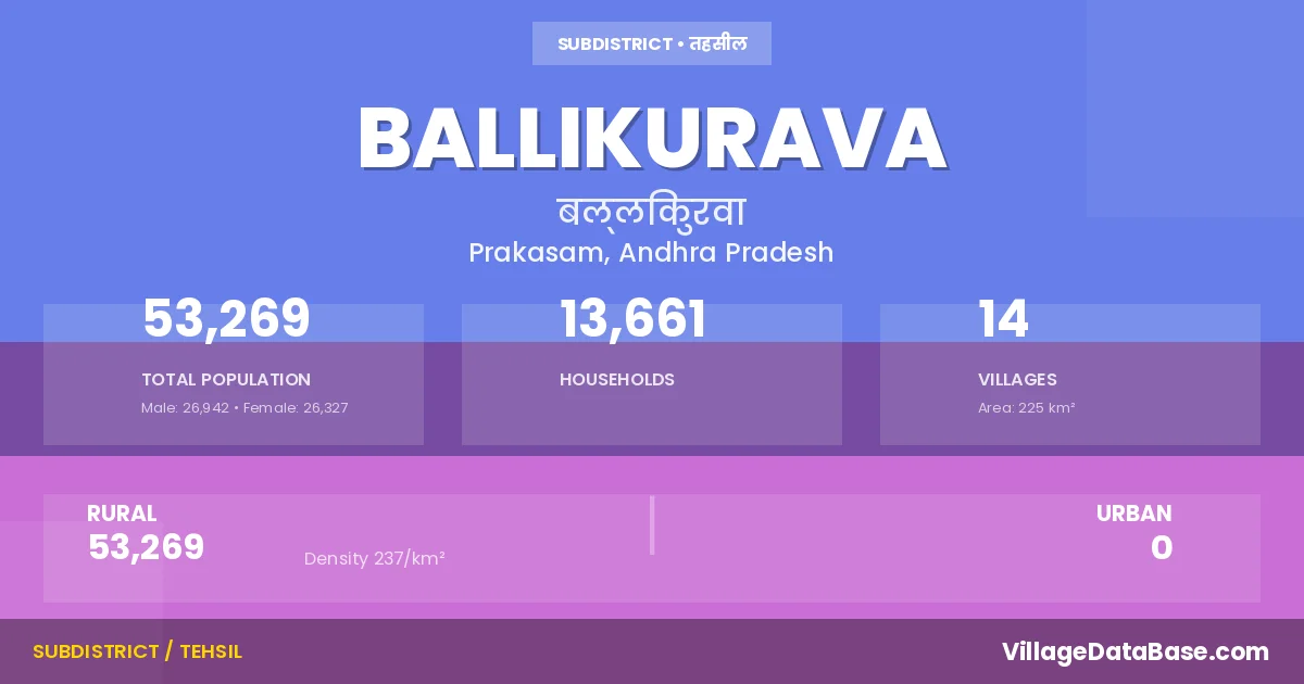 According to the 2011 census The total area of Ballikurava Mandal is 225 km², with a population of 53269 people. The population density is 237 inhabitants per square kilometre, and there are approximately 13661 houses in the sub district.