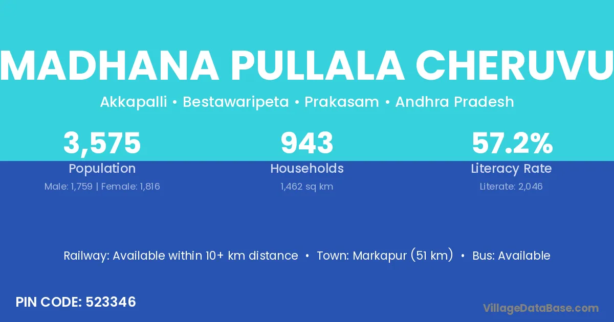 Markapur (51 km) is the nearest town to Madhana Pullala Cheruvu village for major economic activities and is located approximately 51 km away.