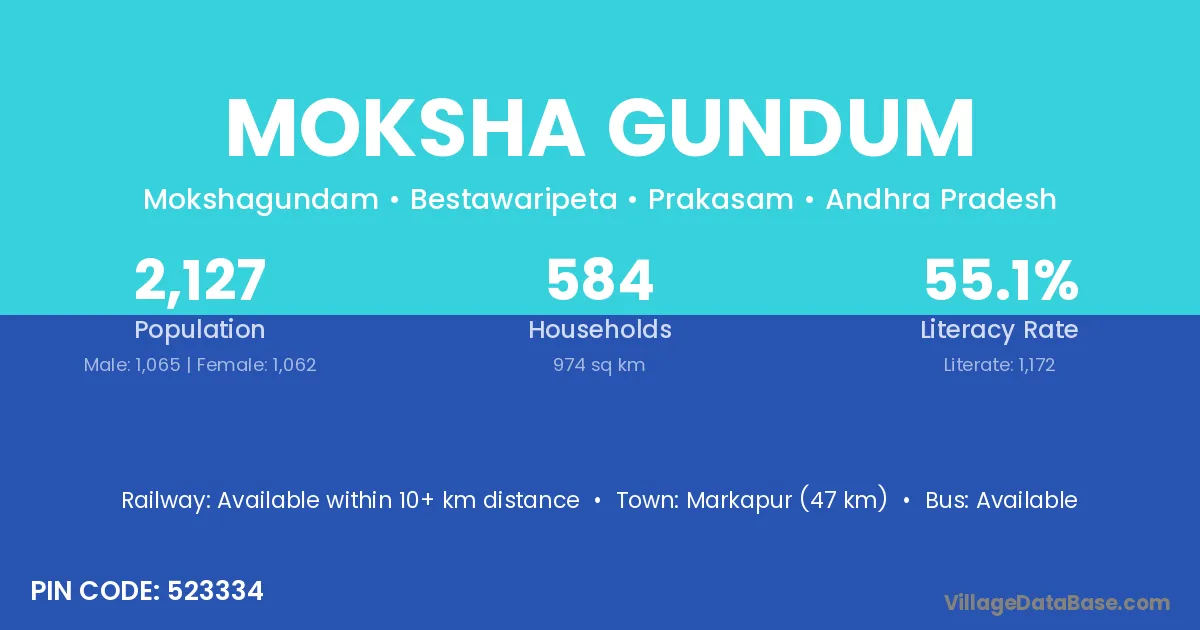 Markapur (47 km) is the nearest town to Moksha Gundum village for major economic activities and is located approximately 47 km away.