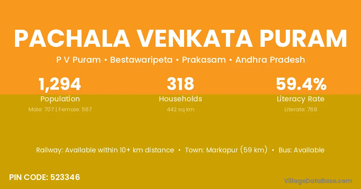 Markapur (59 km) is the nearest town to Pachala Venkata Puram village for major economic activities and is located approximately 59 km away.