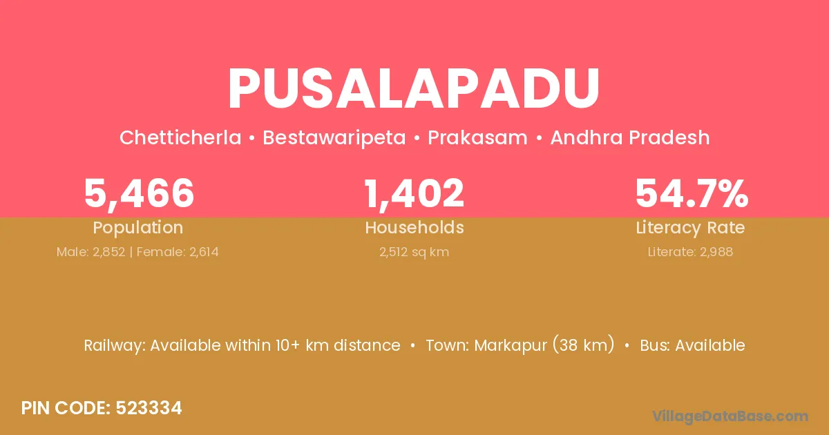 Markapur (38 km) is the nearest town to Pusalapadu village for major economic activities and is located approximately 38 km away.