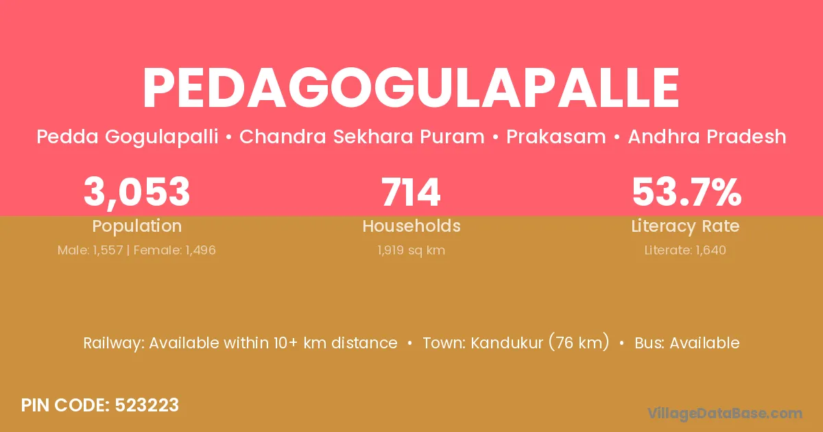 Kandukur (76 km) is the nearest town to Pedagogulapalle village for major economic activities and is located approximately 76 km away.