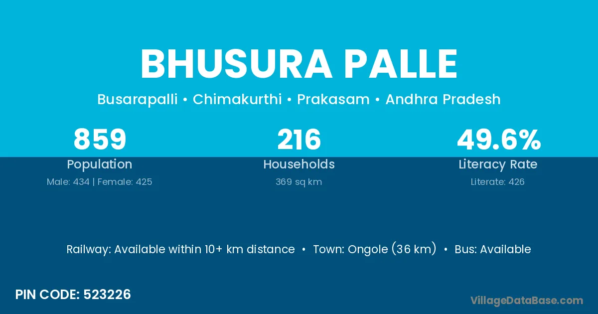 Ongole (36 km) is the nearest town to Bhusura Palle village for major economic activities and is located approximately 36 km away.