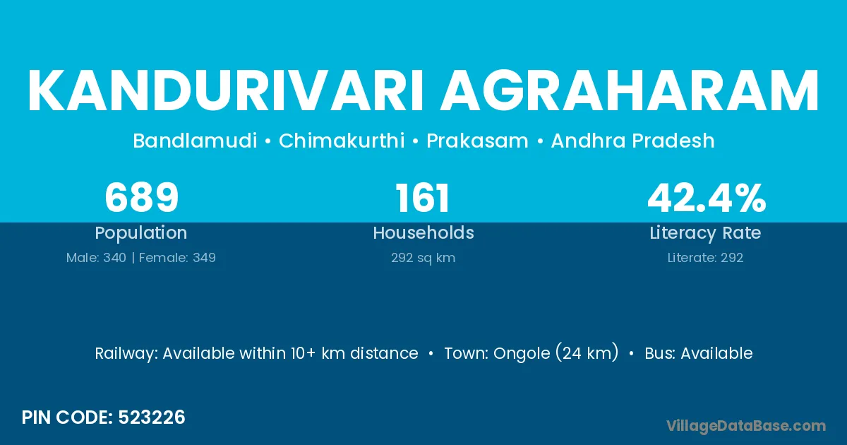 Kandurivari Agraharam village has a total population of 689 people, of which 340 are males and 349 are females.