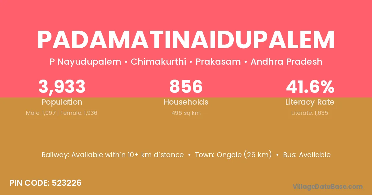 Padamatinaidupalem village has a total population of 3,933 people, of which 1,997 are males and 1,936 are females.
