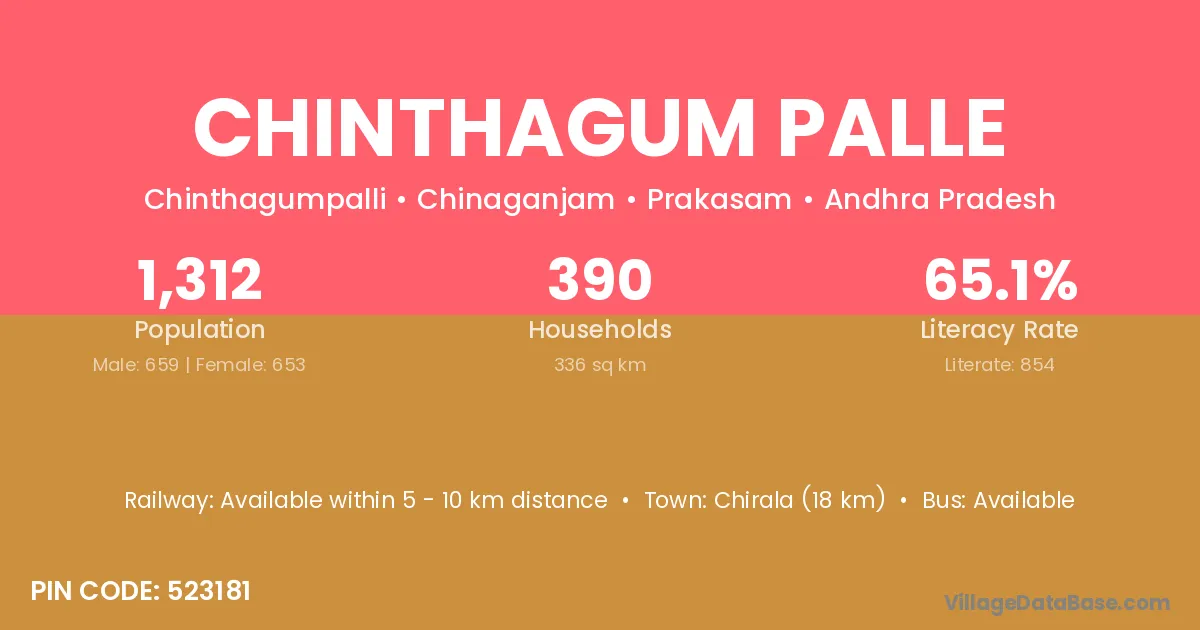 Chirala (18 km) is the nearest town to Chinthagum Palle village for major economic activities and is located approximately 18 km away.