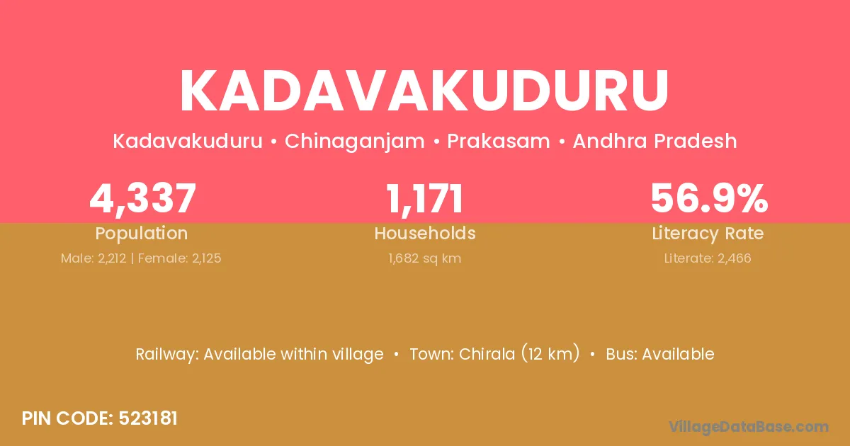 Chirala (12 km) is the nearest town to Kadavakuduru village for major economic activities and is located approximately 12 km away.