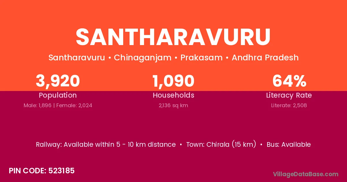 Chirala (15 km) is the nearest town to Santharavuru village for major economic activities and is located approximately 15 km away.