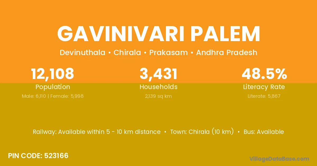 Gavinivari Palem village has a total population of 12,108 people, of which 6,110 are males and 5,998 are females.