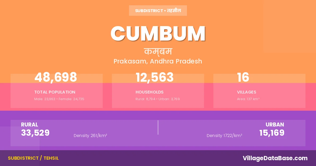 According to the 2011 census The total area of Cumbum Mandal is 137 km², with a population of 48698 people. The population density is 354 inhabitants per square kilometre, and there are approximately 12563 houses in the sub district.