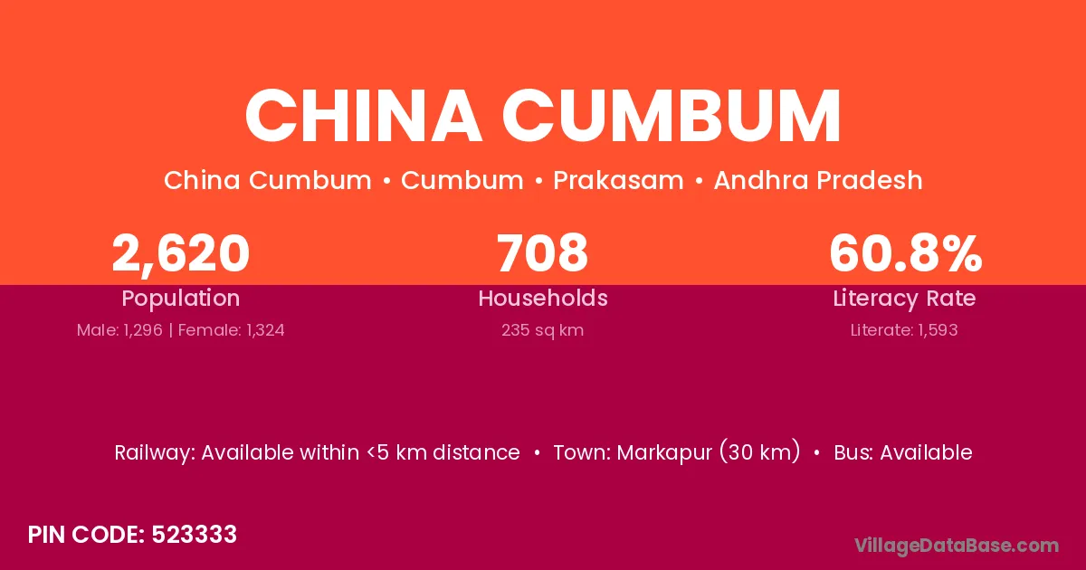 Markapur (30 km) is the nearest town to China Cumbum village for major economic activities and is located approximately 30 km away.