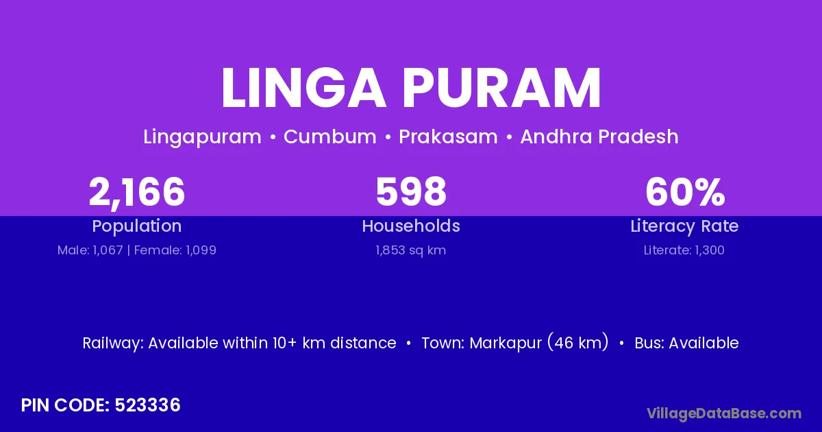 Markapur (46 km) is the nearest town to Linga Puram village for major economic activities and is located approximately 46 km away.