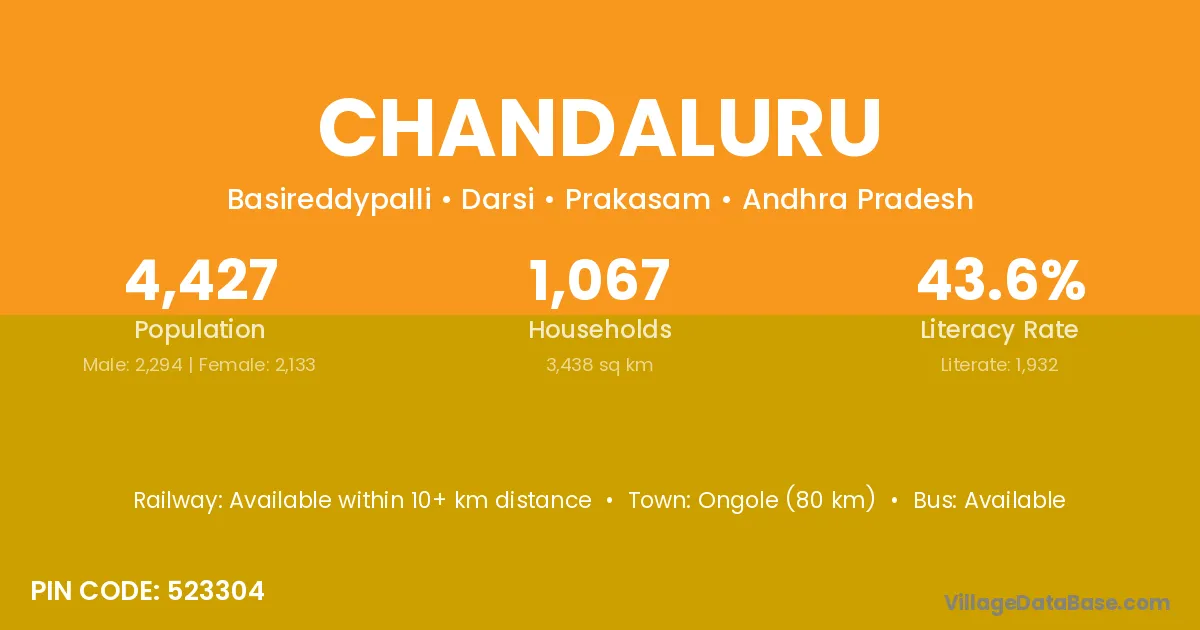 Ongole (80 km) is the nearest town to Chandaluru village for major economic activities and is located approximately 80 km away.