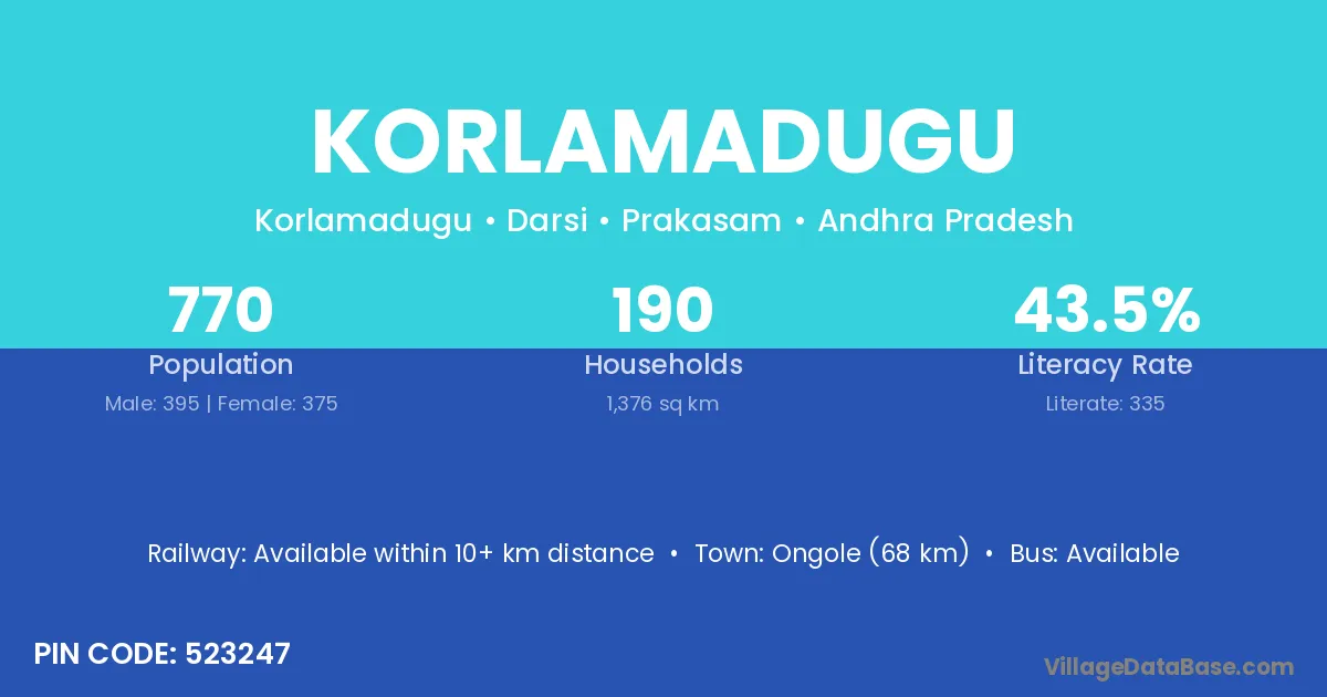 Ongole (68 km) is the nearest town to Korlamadugu village for major economic activities and is located approximately 68 km away.