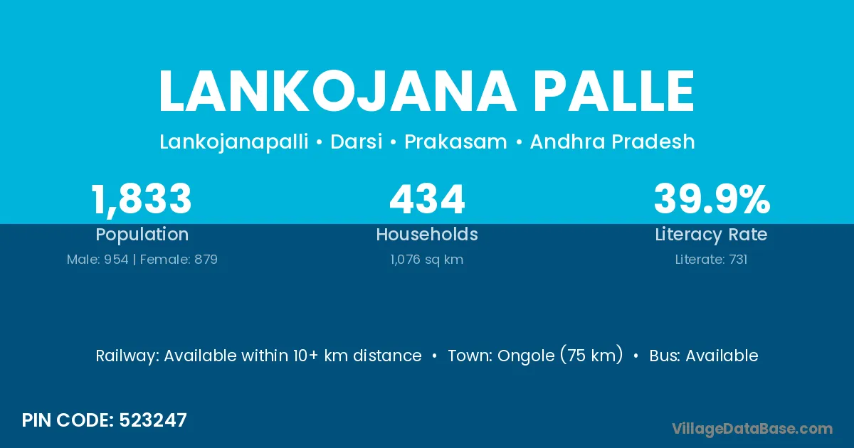Ongole (75 km) is the nearest town to Lankojana Palle village for major economic activities and is located approximately 75 km away.