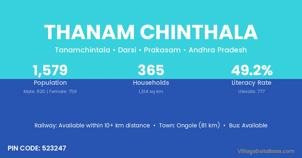 Ongole (81 km) is the nearest town to Thanam Chinthala village for major economic activities and is located approximately 81 km away.