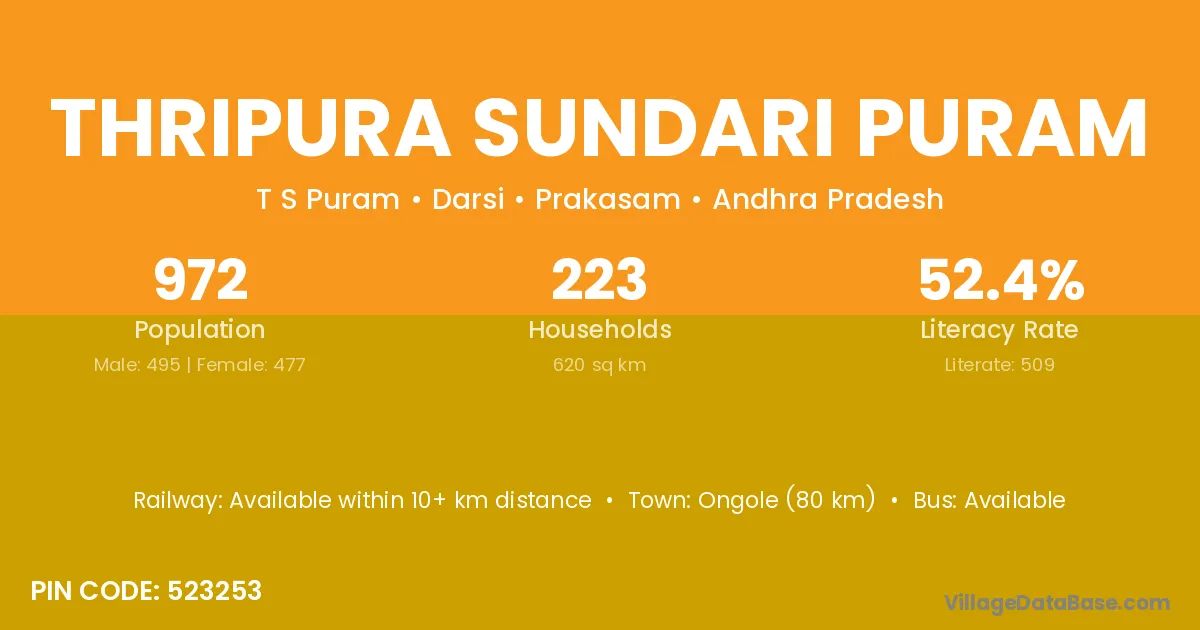 Thripura Sundari Puram village has a total population of 972 people, of which 495 are males and 477 are females.