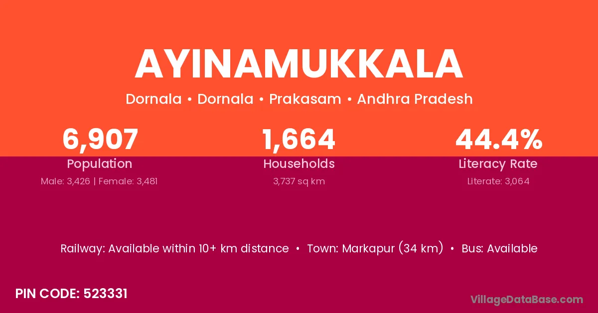 Markapur (34 km) is the nearest town to Ayinamukkala village for major economic activities and is located approximately 34 km away.