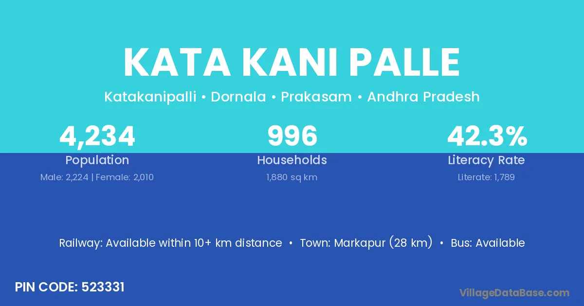Markapur (28 km) is the nearest town to Kata Kani Palle village for major economic activities and is located approximately 28 km away.