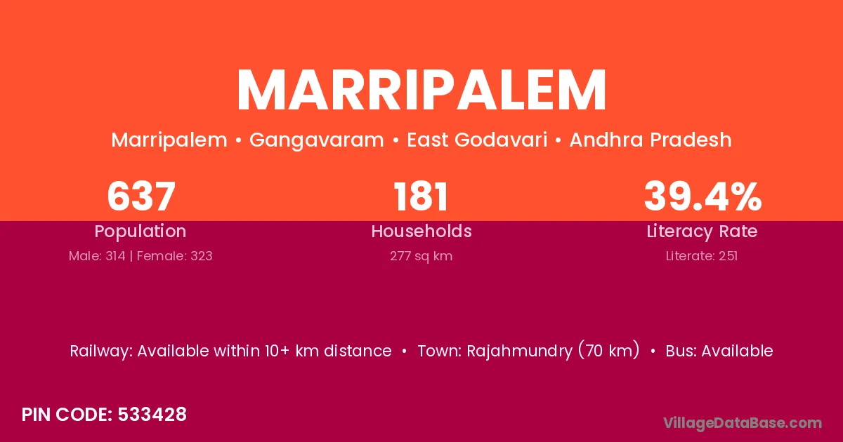 Markapur (45 km) is the nearest town to Marripalem village for major economic activities and is located approximately 45 km away.