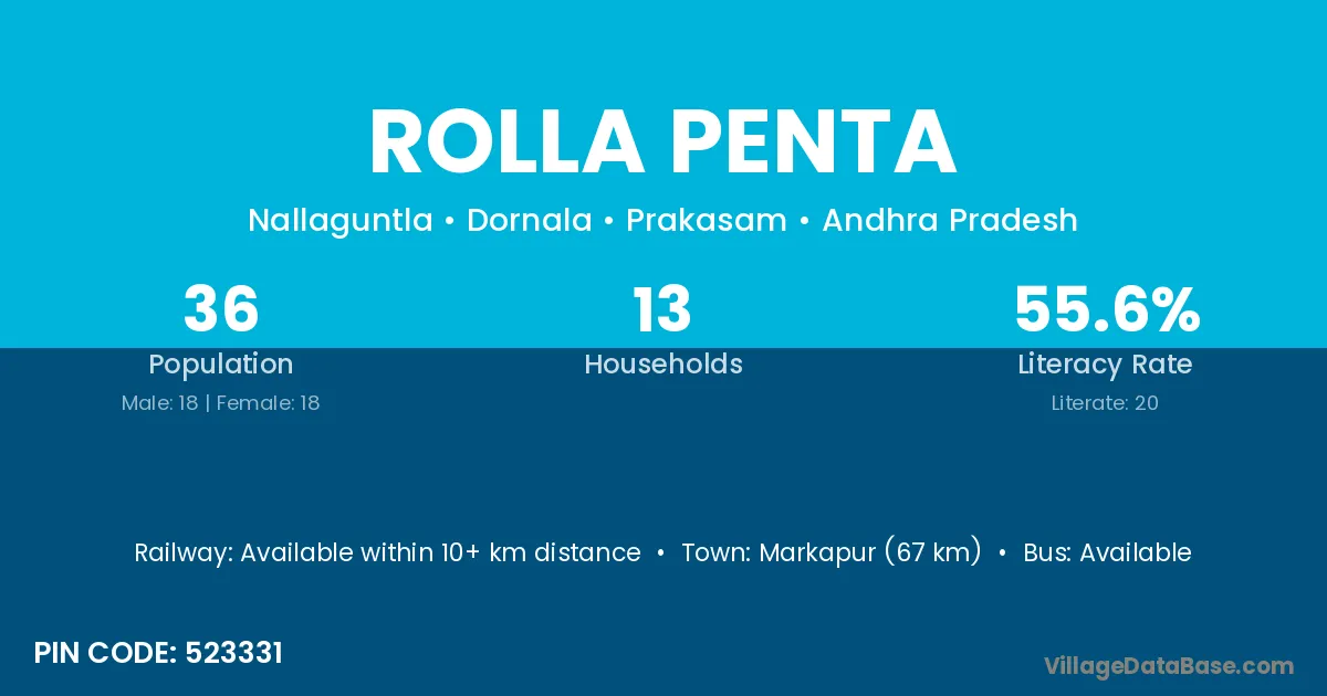 Markapur (67 km) is the nearest town to Rolla Penta village for major economic activities and is located approximately 67 km away.