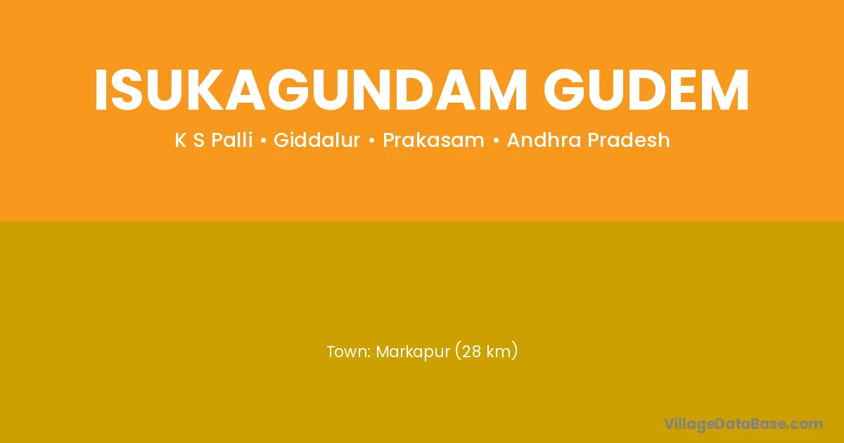 Markapur (28 km) is the nearest town to Isukagundam Gudem village for major economic activities and is located approximately 28 km away.
