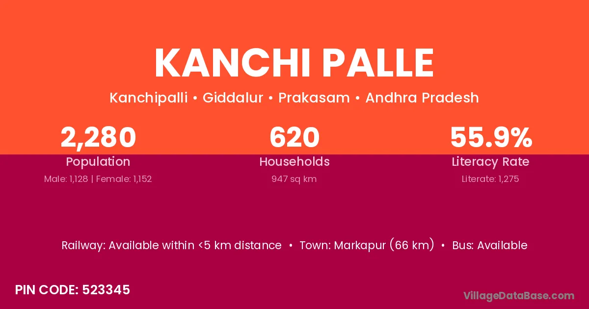 Markapur (66 km) is the nearest town to Kanchi Palle village for major economic activities and is located approximately 66 km away.