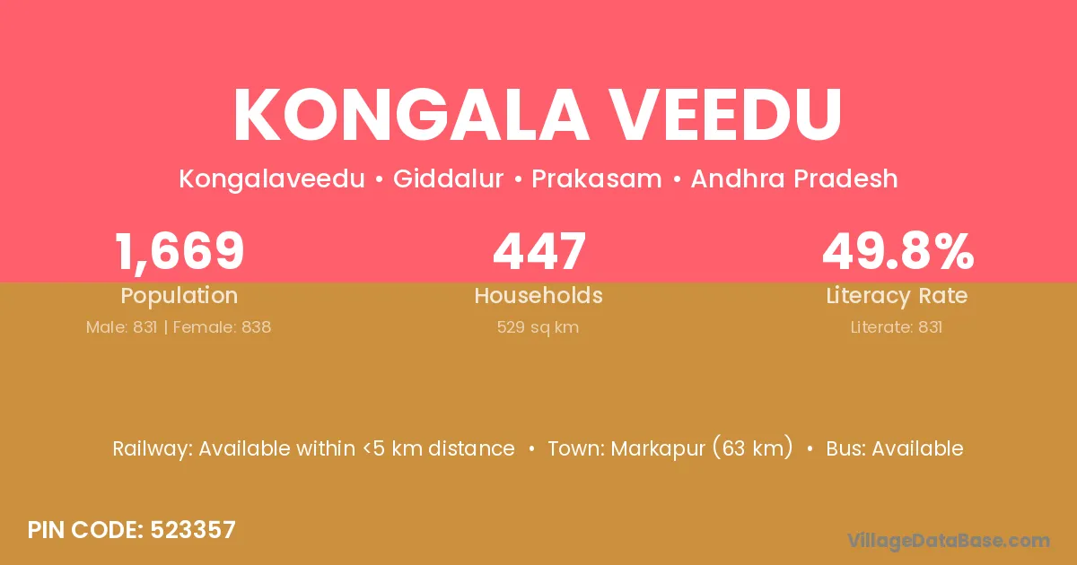 Kongala Veedu village has a total population of 1,669 people, of which 831 are males and 838 are females.