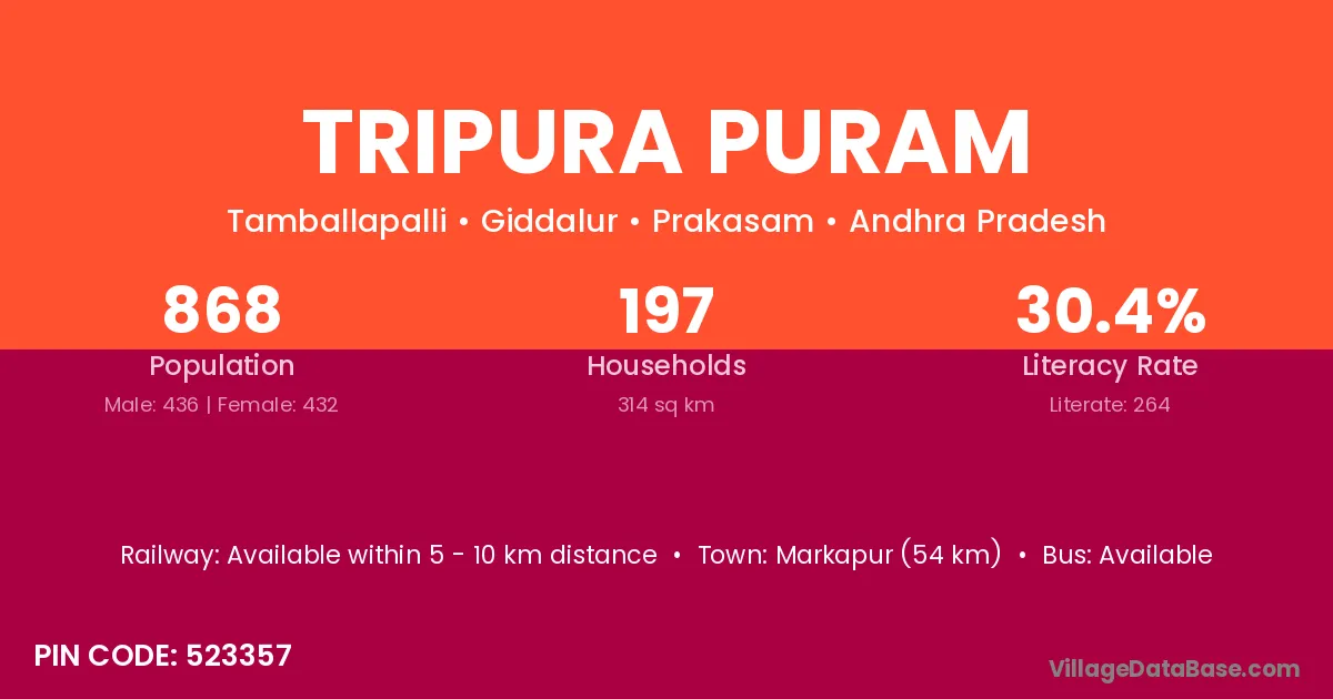 Tripura Puram village has a total population of 868 people, of which 436 are males and 432 are females.