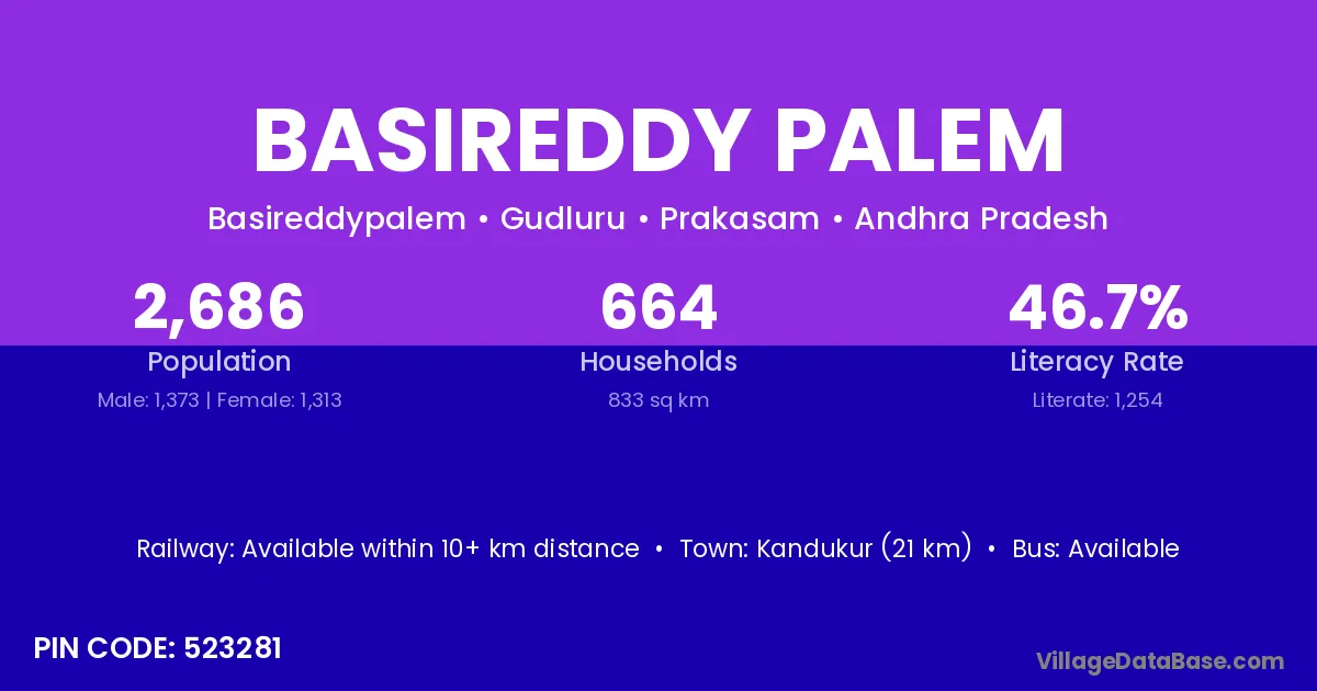 Kandukur (21 km) is the nearest town to Basireddy Palem village for major economic activities and is located approximately 21 km away.