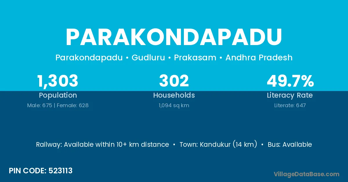 Parakondapadu village has a total population of 1,303 people, of which 675 are males and 628 are females.