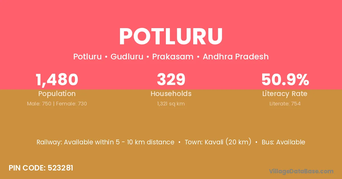 Potluru village has a total population of 1,480 people, of which 750 are males and 730 are females.