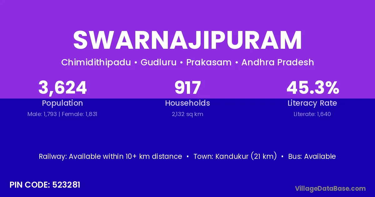 Kandukur (21 km) is the nearest town to Swarnajipuram village for major economic activities and is located approximately 21 km away.