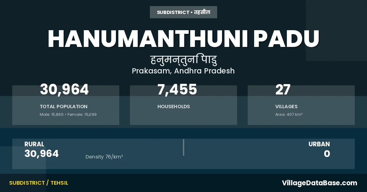 According to the 2011 census The total area of Hanumanthuni Padu Mandal is 407 km², with a population of 30964 people. The population density is 76 inhabitants per square kilometre, and there are approximately 7455 houses in the sub district.