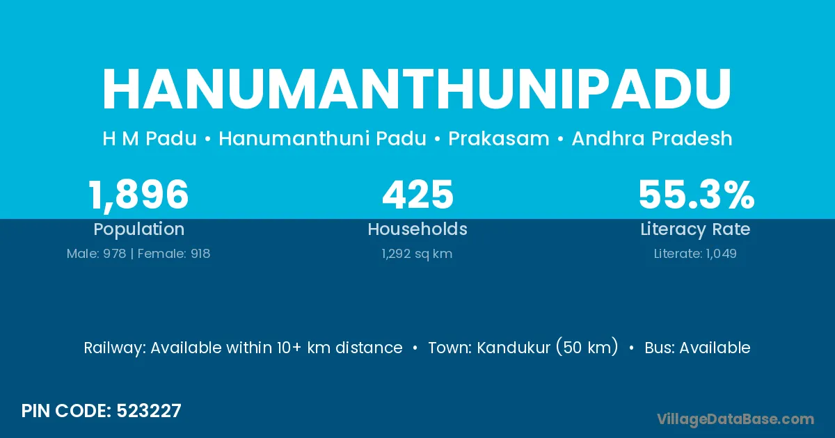 Kandukur (50 km) is the nearest town to Hanumanthunipadu village for major economic activities and is located approximately 50 km away.